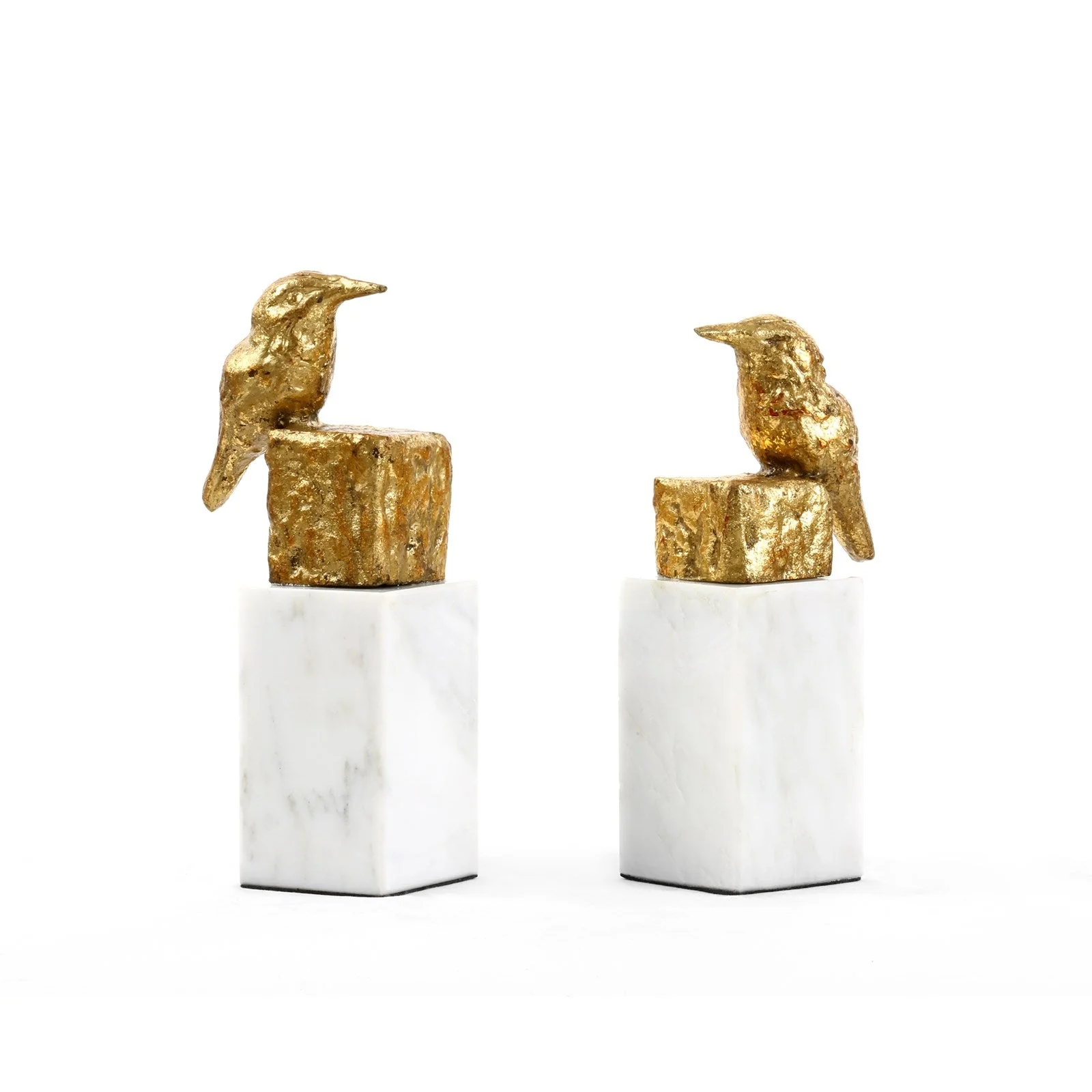 Juxtaposed with their delicate forms, the raw, elemental finish of our Finch Statues provides the petite pair of birds an unexpected boldness. It’s impossible not to admire their charming presence or gilded display, perched lightly on contrasting blocks of the same gold leaf. Elongated white marble bases give the decorative pair a distinctly sculptural feel, like magical miniature monuments for your desk, side table, console, or bookshelf. Place together or create a symmetrical motif on either side of a long tabletop or mantel, or across two side tables flanking a sofa.