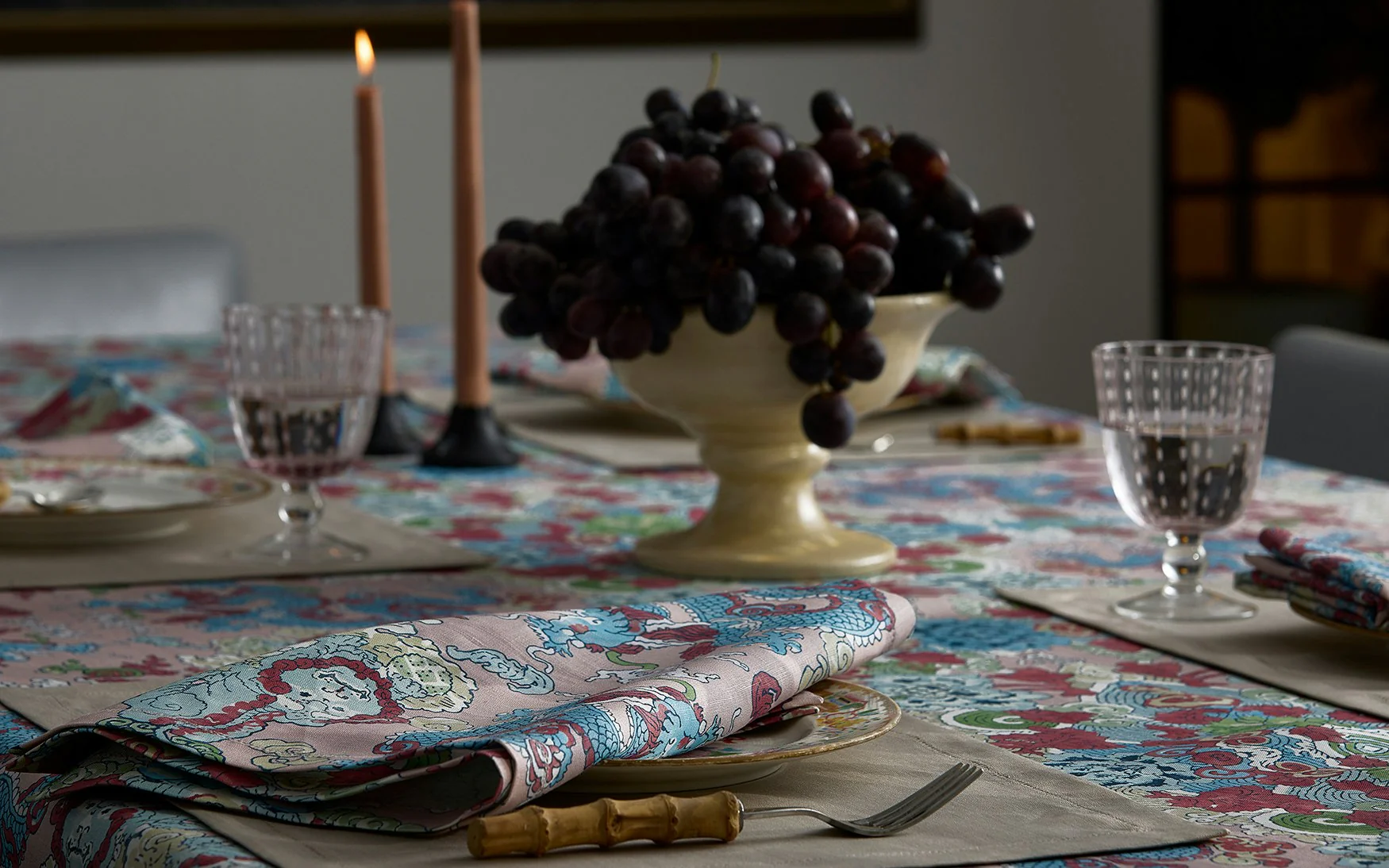 Celebrating the fantastical motifs of ancient myth and legend, Schumacher's Magic Mountain features a psychedelic formation of foo dogs and fire-breathing dragons. Printed in Portugal on our signature table linen, this is a collection designed to make a statement—the perfect backdrop for both special occasions and everyday dining.