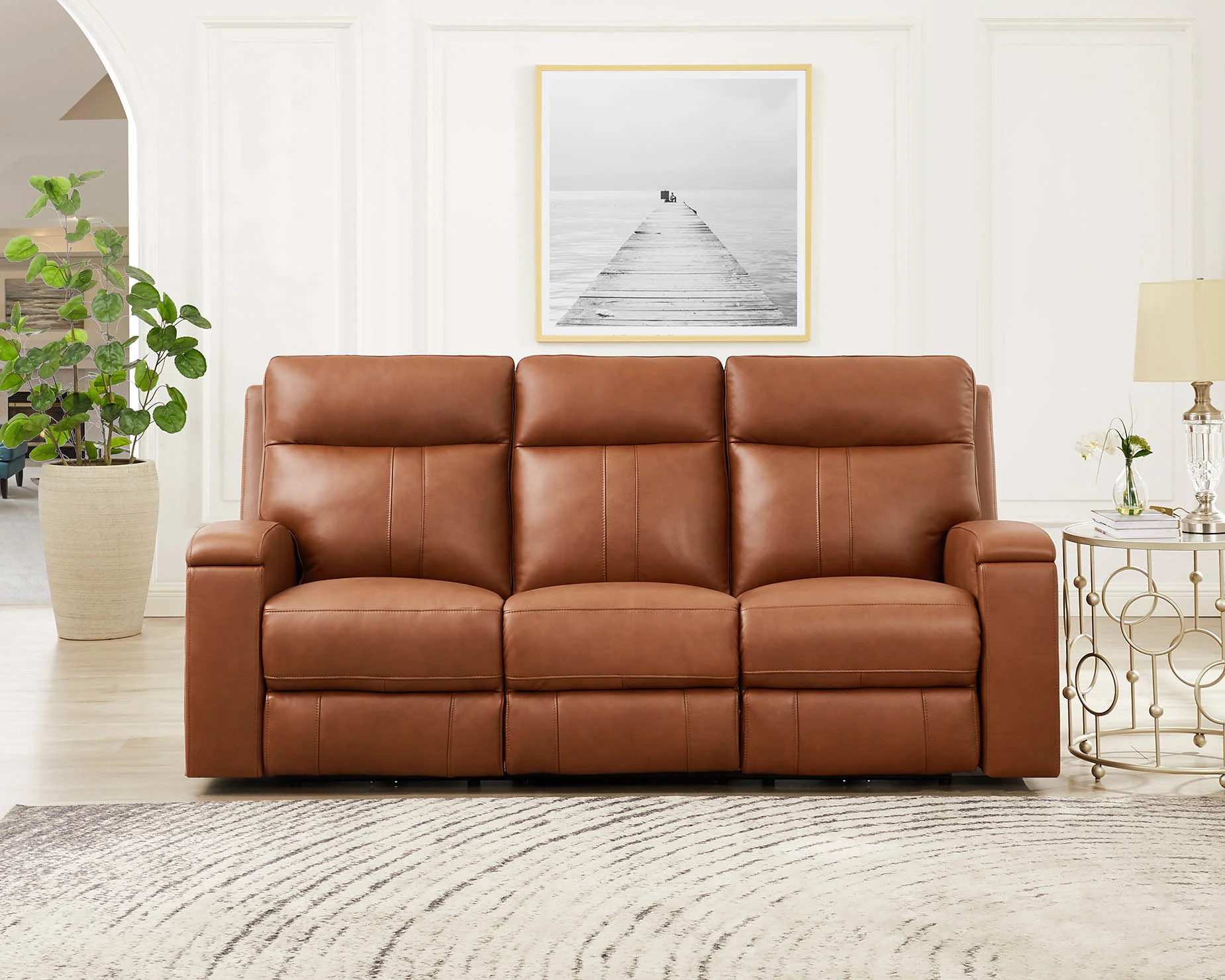 - Premium Leather: Top-grain leather is upholstered on the seating areas and armrests. Leather match is used on the sides and back.